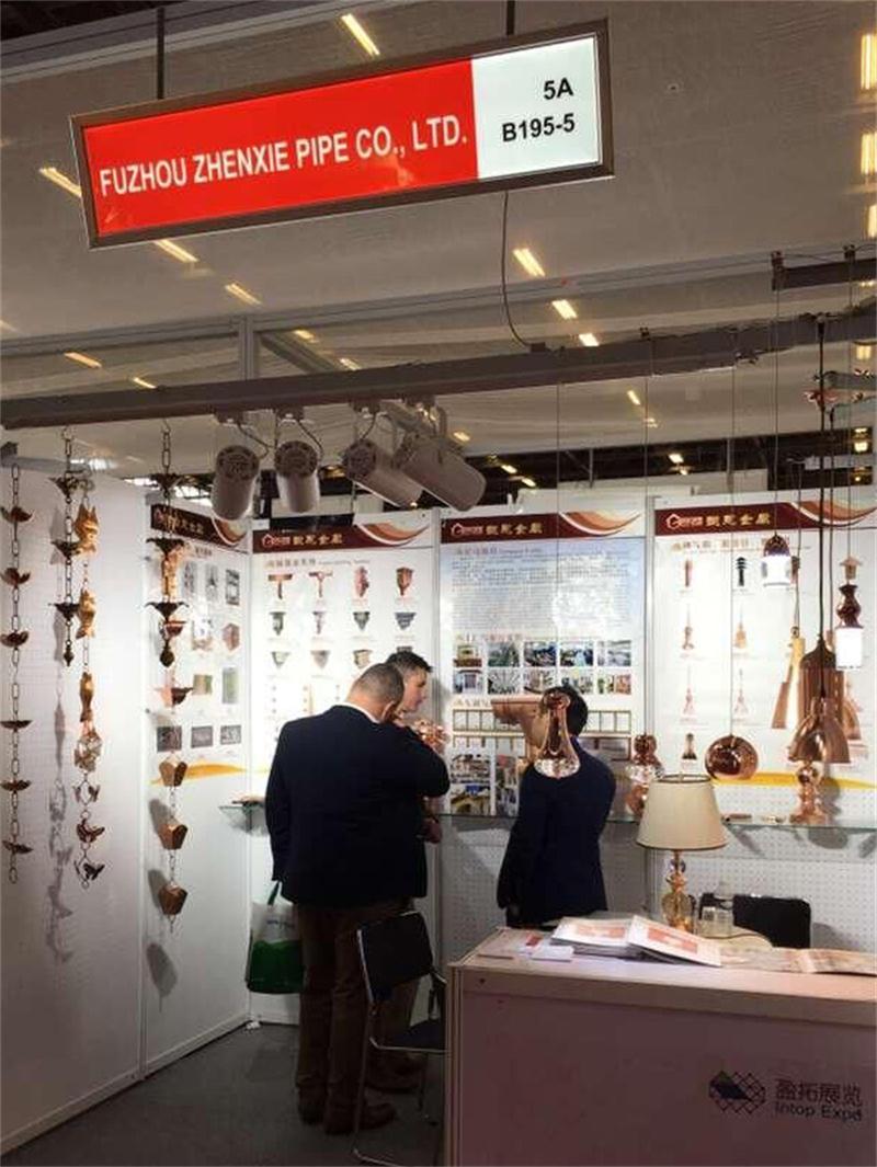 振协在法国建材展上展出三大系列产品:金属落水系列,室外铜装饰系列以及新款的铜灯饰品系列。